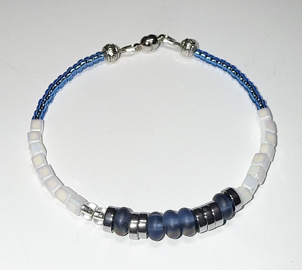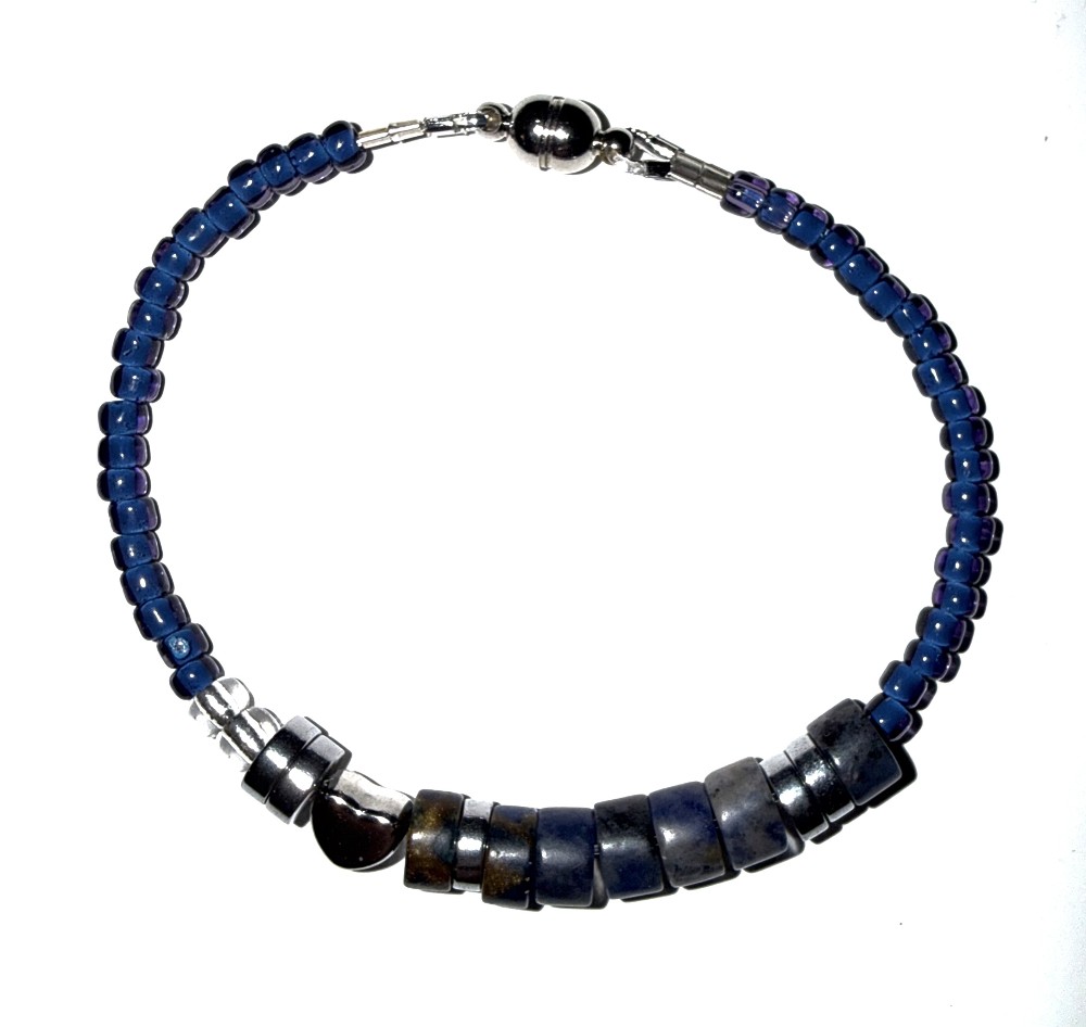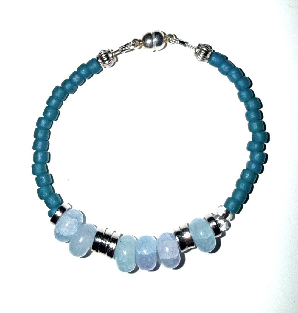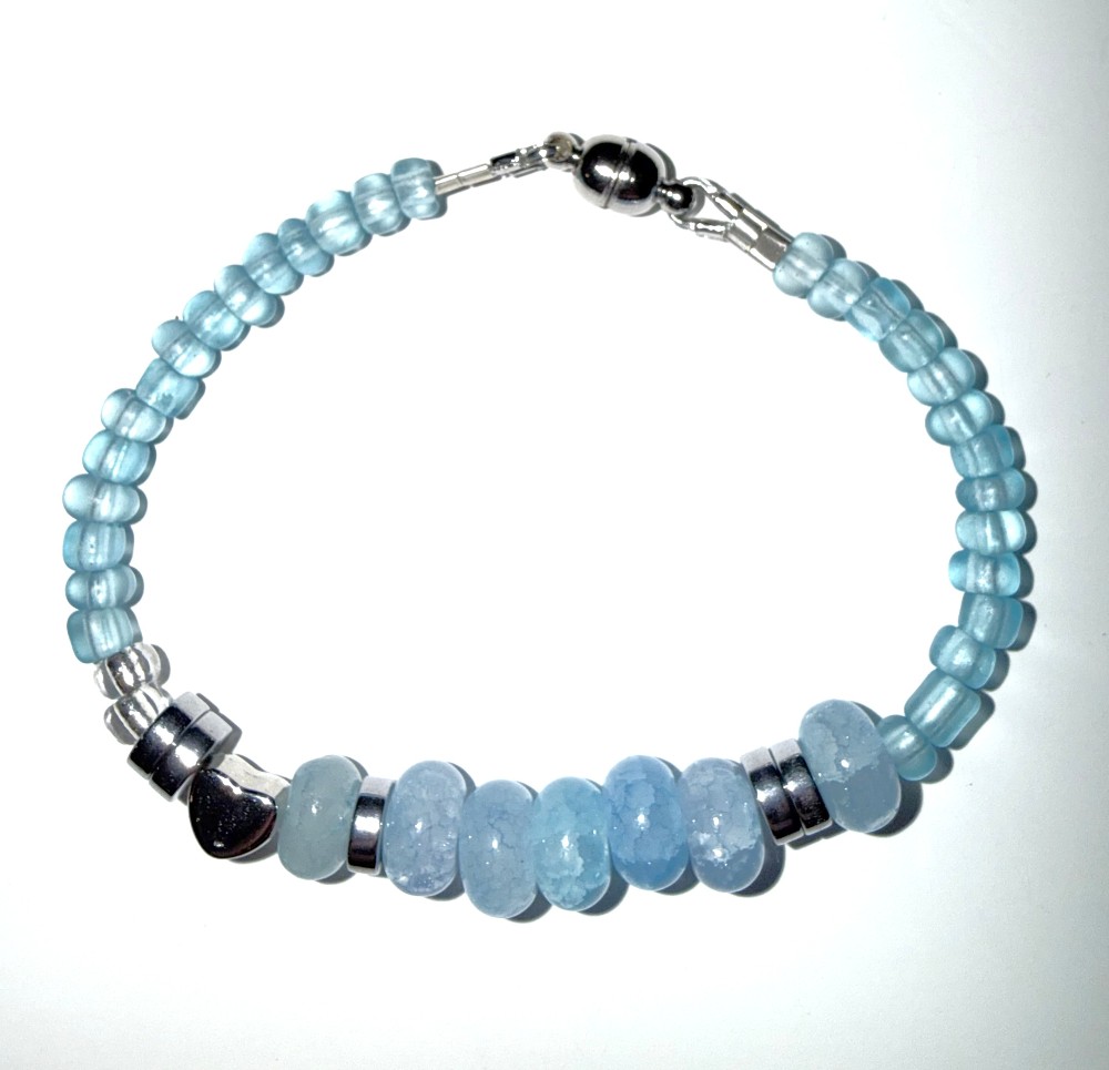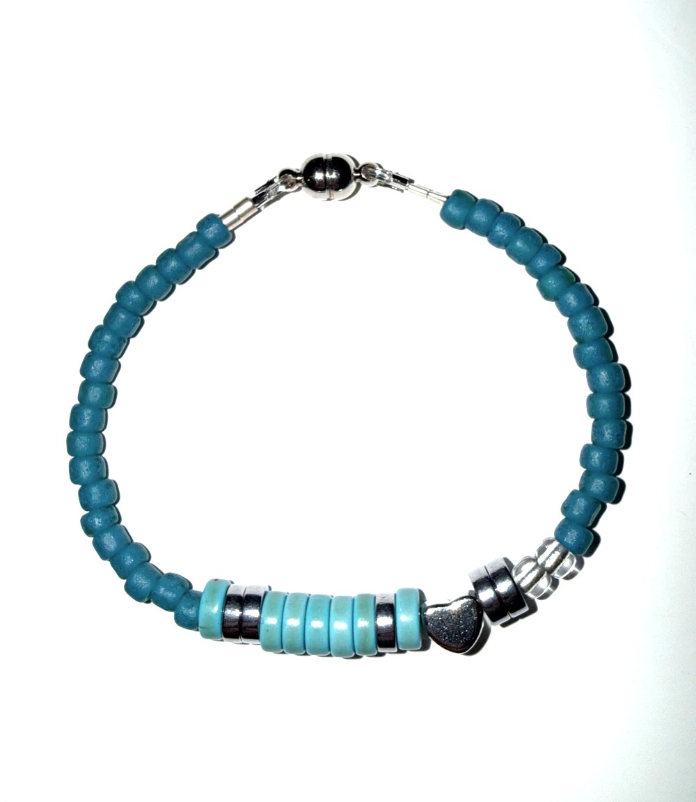 A handcrafted blue beaded bracelet with "I Love You" message in Morse code. Finished with a secure magnetic clasp for easy wear.
