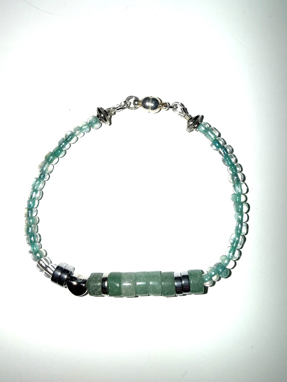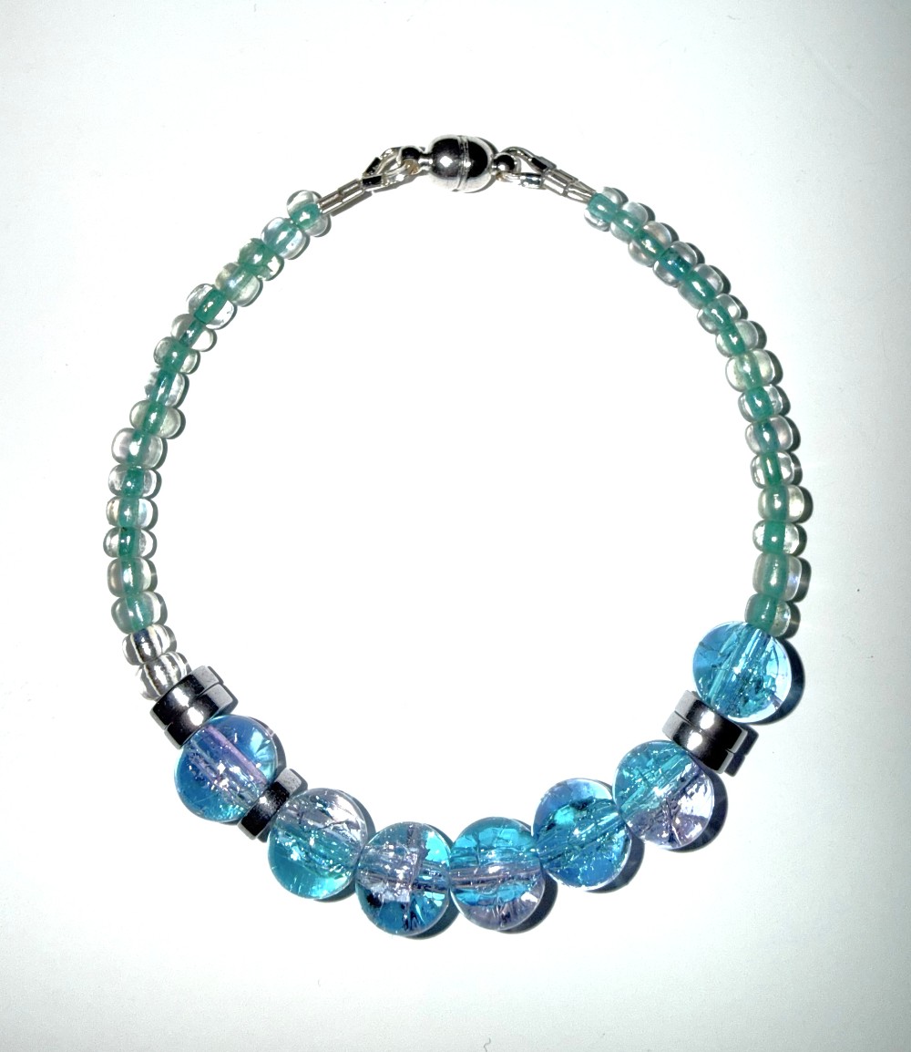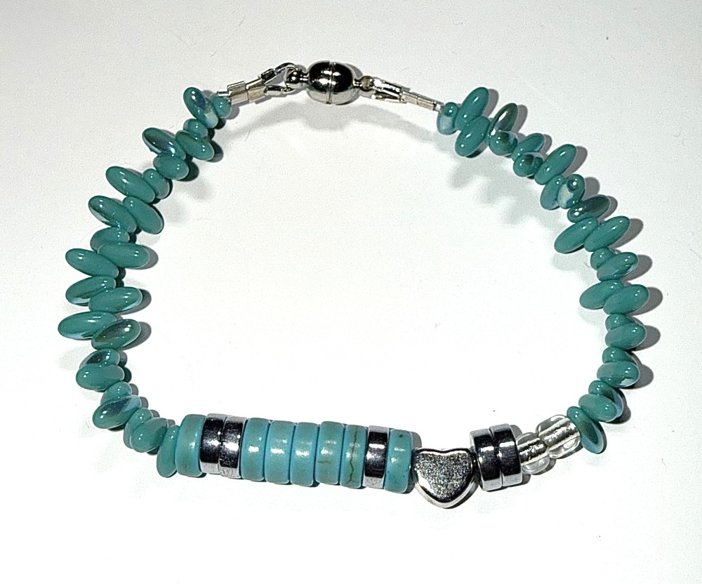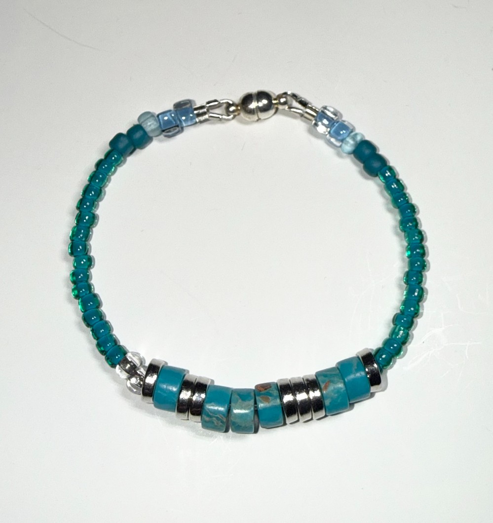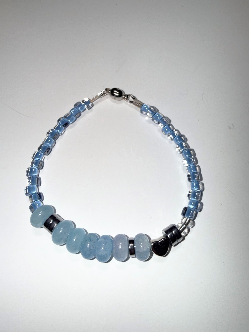A handcrafted blue beaded bracelet with "I Love You" message in Morse code. Finished with a secure magnetic clasp for easy wear.