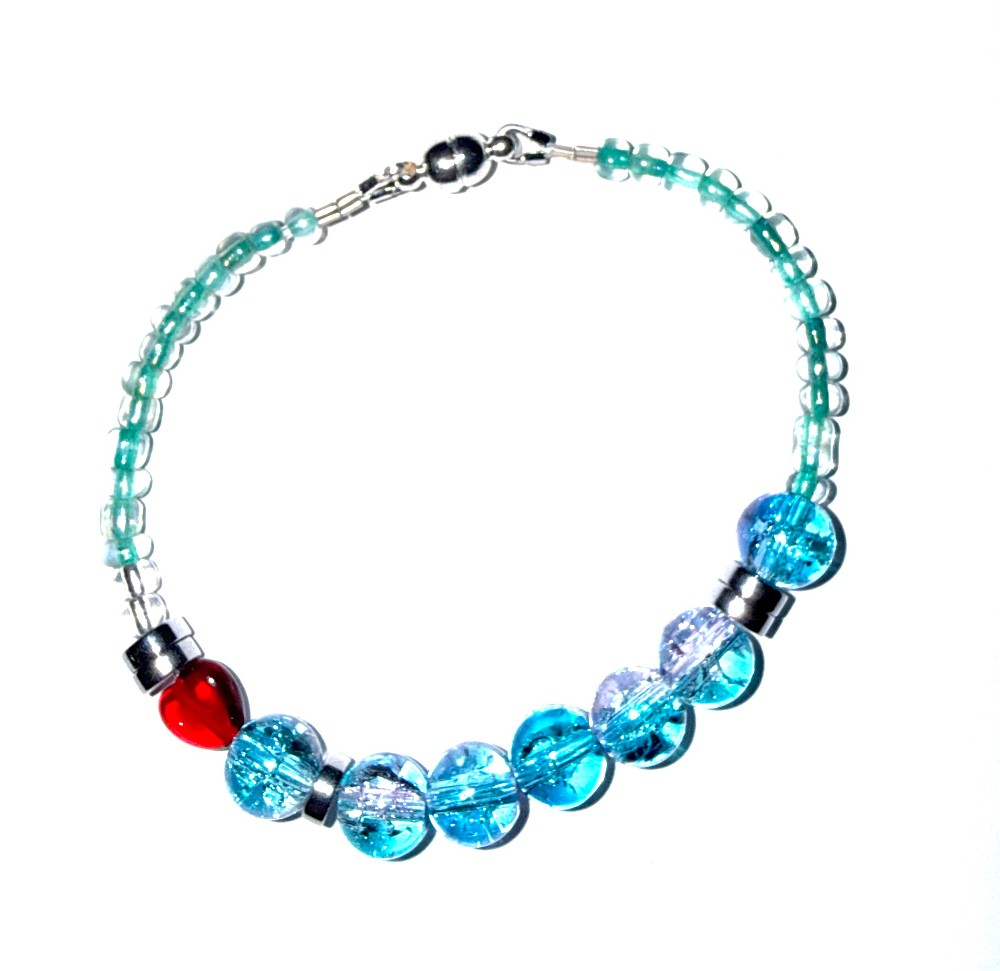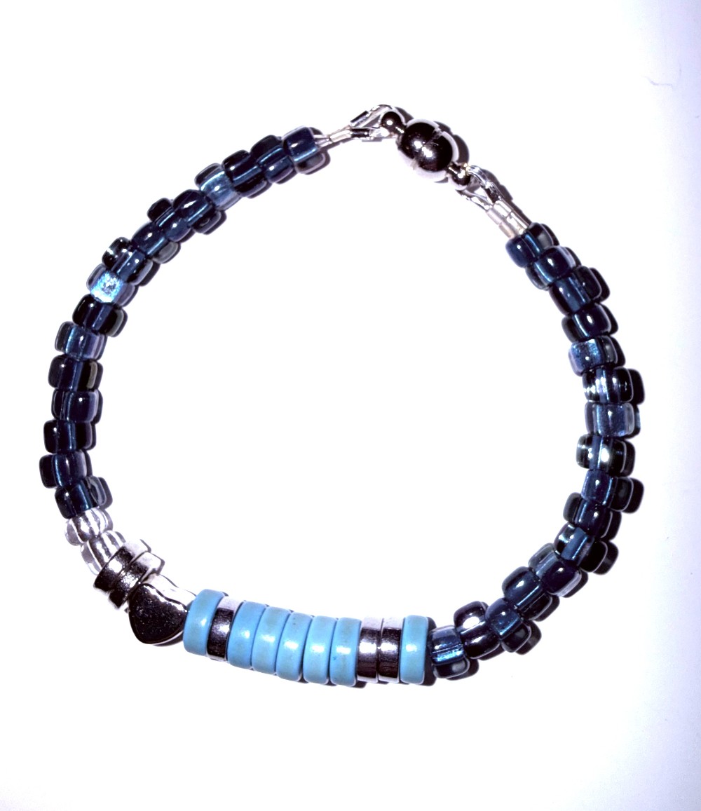 Handcrafted blue beaded bracelet with “I Love You” message in Morse code.