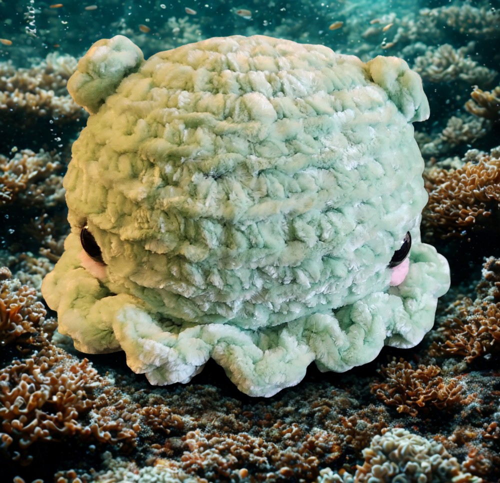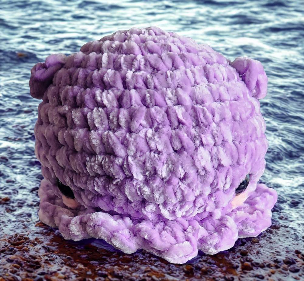 This handmade cuddlefish plush is crafted with ultra-soft chenille yarn, giving it a chunky, cozy feel that’s perfect for cuddling or display. Its round body and soft, squishy shape make it an adorable and comforting ocean-inspired companion.