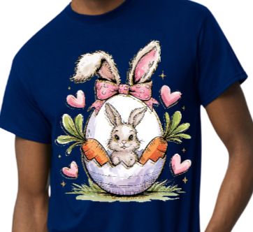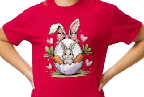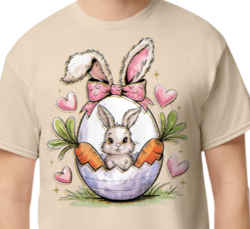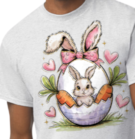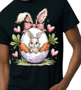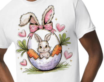 Adorable Easter Bunny design featuring a bunny nestled in an egg-shaped basket filled with carrots, hearts, and festive spring decorations.