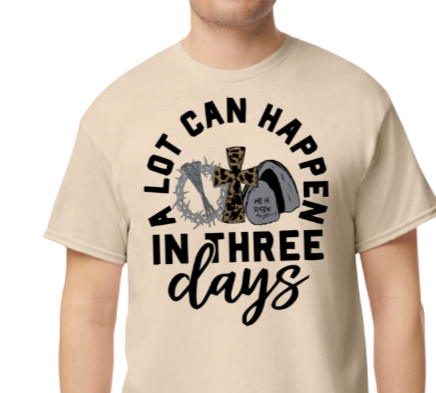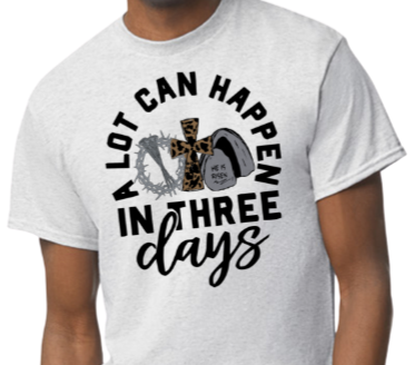 “A Lot Can Happen in 3 Days” design inspired by the powerful message of hope, resurrection, and new beginnings. A meaningful reminder of faith and transformation.