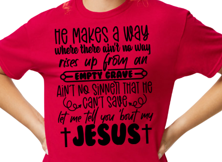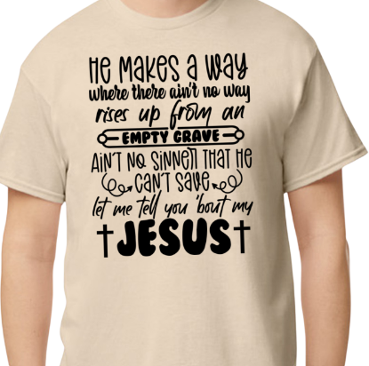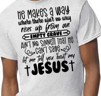 Unisex shirt with the lyrics of Let Me Tell You About My Jesus.