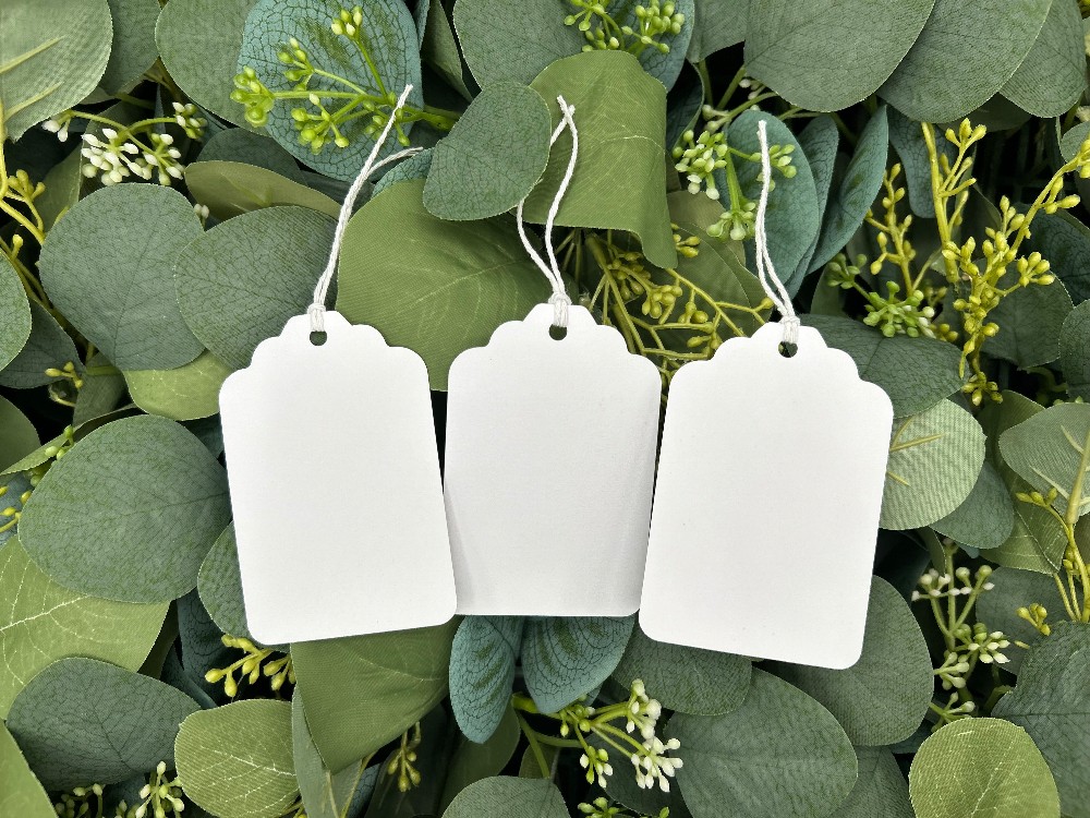 Each tag is approximately 2" wide and 3" high and includes a twine string that is 2.5" long after it's attached to the tag.