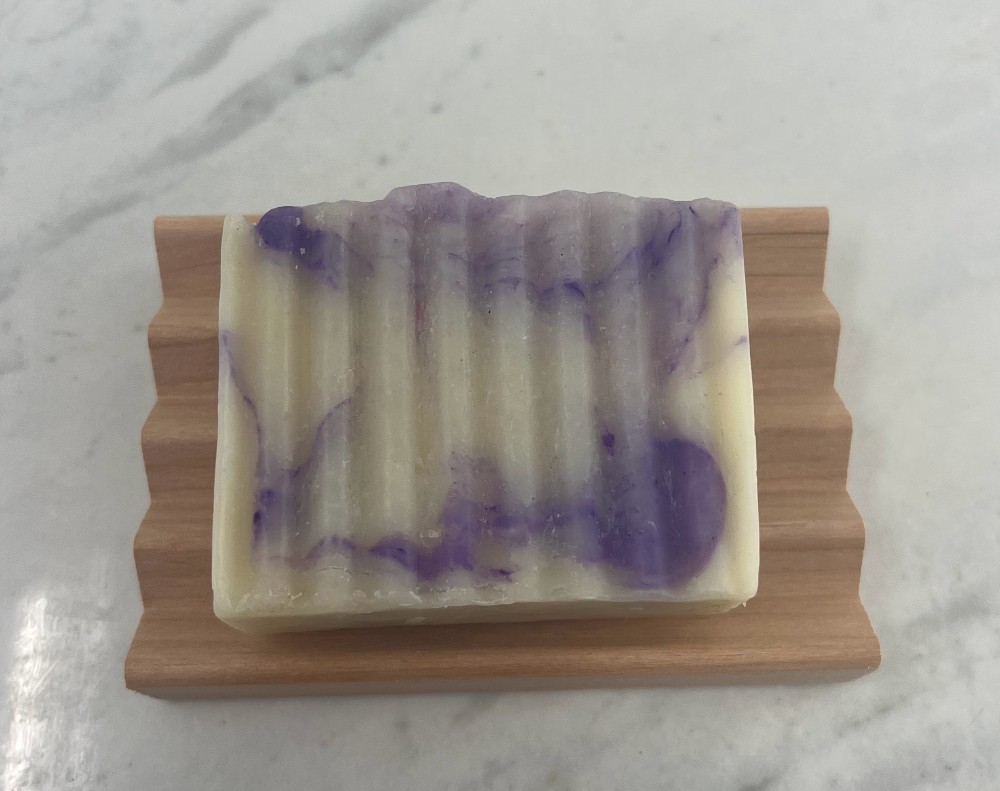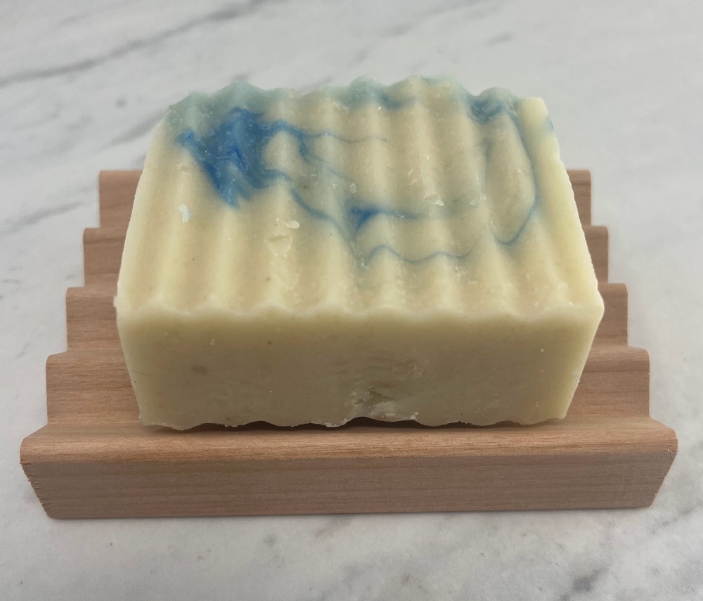 Fresh Linen Shampoo Bar with wooden soap dish